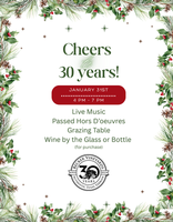 Included in event ticket: 1 glass of wine, passed hors d'oeuvres, grazing table, 30th year anniversary wine glass.