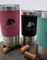 Elevate your drinkware with Becker Vineyards Leather-Wrapped Tumblers. Featuring a sleek stainless steel design with an insulated interior, these tumblers keep your beverages at the perfect temperature. Wrapped in elegant, embossed leather in a variety of colors, they combine style and function for wine lovers on the go.